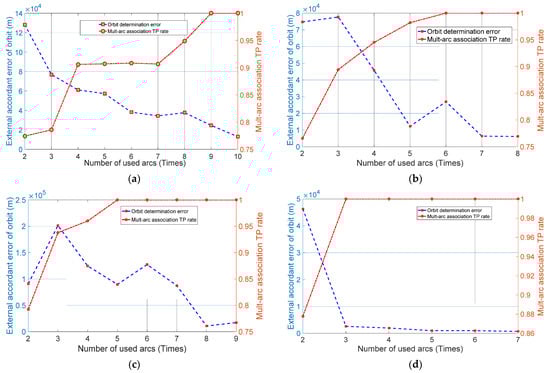 Overall cataloguing performance with different observations against the number of used arcs. (a) The space-based simulation data; (b) The real data of GEO objects from Changchun GEO EA; (c) The real data of GEO objects from FocusGEO; (d) The real data of LEO objects from Changchun LEO EA.