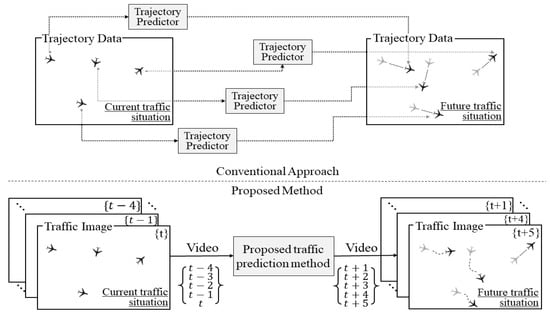 Building upon these previous studies, this paper introduces a new paradigm for air traffic prediction. In conventional approaches, the aircraft trajectories are individually predicted and combined to construct a future traffic situation. However, in the proposed method, the overall air traffic situation in a specific airspace at an instantaneous time is considered as an image, and a data-driven model is trained to learn how this image changes over time as illustrated in Figure 1. In other words, the proposed method considers the task of air traffic prediction as a video prediction problem from a deep learning perspective. Once the model is trained with historical data, future air traffic situations can be predicted as a sequence of subsequent images based on the model. Note that a sequence of air traffic images contains a wealth of information about not only individual aircraft trajectories, but also their interactions with neighboring traffic and other environmental factors, such as the runway configuration.