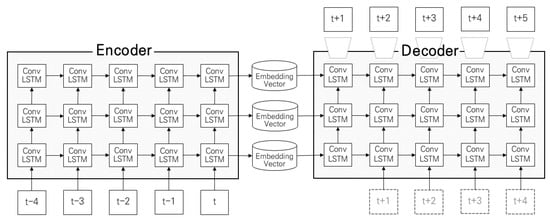 As shown in Figure 2, both the encoder and the decoder contain three layers of ConvLSTM, and each layer contains 64 hidden states with 3 × 3 kernels. The model accepts five image frames as input and predicts the next five image frames as output. An additional output layer (3D CNN) is used to reconstruct an output image sequence after the last layer of ConvLSTM. The specifics of the model are shown in Table 1.