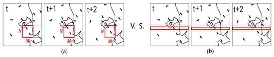 To better capture the spatiotemporal correlation in air traffic images, convolutional long short-term memory (ConvLSTM) is used in both the encoder and decoder networks [16]. LSTM has been proven to be stable for handling the temporal features of sequential data, but it easily overlooks the spatial natures of images [17,18]. ConvLSTM is a variant of LSTM for which the input-to-state and state-to-state transitions are exchanged with convolutional operations with an grid called a kernel (Figure 3a). Therefore, ConvLSTM is better at retaining both the temporal and spatial information of an image than conventional LSTM, in which a two-dimensional (2D) image is flattened into a 1D vector (Figure 3b).