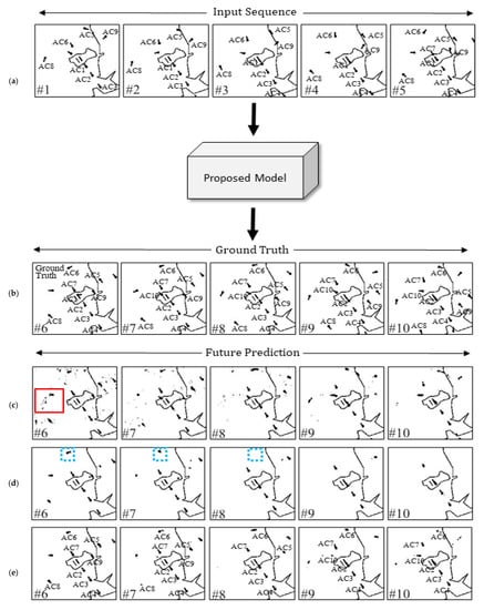 It is interesting to note that the model could show that AC1 disappeared from the predicted images because it has landed in scene #5. The proposed model could also make successful predictions for departing flights (such as AC5–AC7) from the same runway where they make a U-turn to the right along the SID when they arrived 10.6 miles away from the runway threshold, as shown in Figure 6e. It should also be noted that the proposed model allows for a new aircraft to start to appear in the predicted image (AC10 in Figure 6e #9) although that aircraft did not exist in the input images. The proposed model still suffers from the loss of some flights in the predicted images. For instance, AC8 departed from runway 34 of ICN and AC9 departed from the Gimpo Airport (GMP) nearby and they vanish more quickly from the predicted images than other flights.