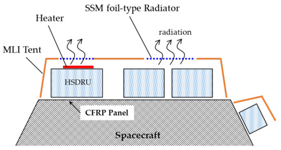 Figure 2 presents the schematic thermal control strategy of the equipment at a satellite level. The HSDRU mounted on the external side of the CFRP honeycomb panel structure with a low thermal conductivity value of 2.2 W/m-K and 1.6 W/m-K in in-and out-of-plane, respectively, is decoupled in a deep space environment by utilizing a multi-layer insulator (MLI) supported by an MLI tent structure. The area of the upper housing of the HSDRU is radiatively coupled with deep space using a second surface mirror (SSM) foil-type radiator [7] for the heat waste of equipment during its mission operation. The excessive heat waste to deep space through the foil radiator is compensated by an additional heater attached on the upper housing when the electronic device is turned off.