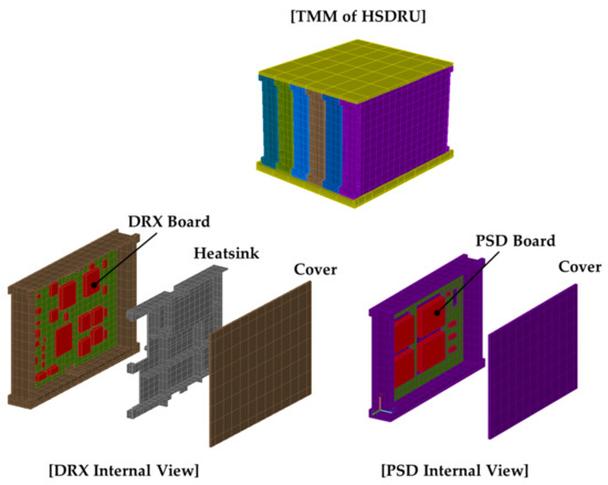 Figure 8 illustrates the finite element model (FEM) of an HSDRU constructed in MSC patran and Nastran to validate the structural safety of an HSDRU under qualification vibration loading test conditions. The FEM comprises 3,127,417 elements, 1118 MPC, 158 lumped masses connected with RBE2 (electronic components), and 6 DOF constraints at the mounting interface of the unit. The six degrees of freedom at the mounting interfaces of an HSDRU are rigidly fixed.