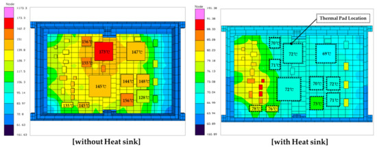 Figure 7 presents one of the representative thermal analysis results of the HSDRU with and without heat sinks. The temperature contour on the PCB indicated that the temperature of the components was significantly attenuated by the heat sink’s design applications. In addition, all components agree with the derating requirements and application rules for EEE electronic components [5,6]. These analysis results indicate that the thermal design strategy proposed in this study is effective for the heat reduction in a DRX with high power density.