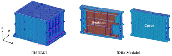 To verify the effectiveness of the thermal design strategy of an HSDRU with high-power density, thermal analysis was performed. Figure 5 illustrates the thermal mathematical model (TMM) of an HSDRU constructed in Thermal Desktop, a CAD-based geometric interface in systems improved numerical differencing analyzer/fluid integrator (SINDA/FLUINT) [11,12]. TMM and the output of RadCAD, which is a module for calculating radiation exchange factors, are analyzed via SINDA/FLUINT.
