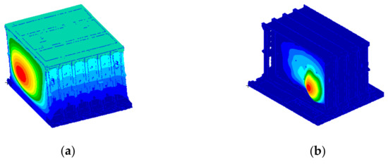 Figure 9. Modal analysis results of HSDRU. (a) First 338.9Hz (global bending mode). (b) Sixteenth 775.7 Hz (local mode, DRX heat sink).