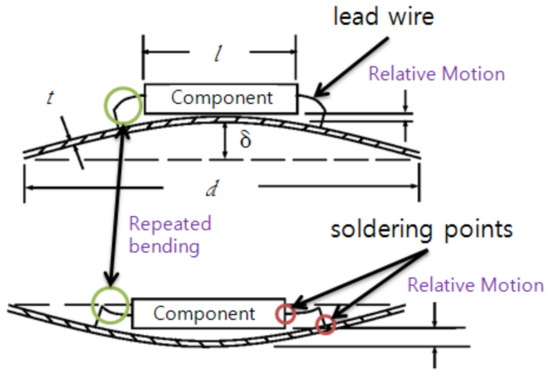 PCB resonances can produce stress in the electrical lead wires owing to the relative motion between the component body and the PCB. Figure 10 illustrates the relative bending motion in which stress is generated on the lead part of components by the relative behavior of the PCB at the resonance frequency when vibration is applied. In this study, to verify the requirements for all components and calculation of the margin of safety, the maximum displacement of the PCB was calculated, based on Steinberg’s fatigue failure theory, to compare it with the maximum allowable deflection [1,13].