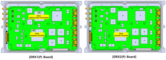 Figure 3 shows a mechanical configuration of an HSDRU for spaceborne synthetic aperture radar applications. The equipment comprises a primary and redundant power supply for the HSDRU (PSD), a digital receiver (DRX), and a mother board unit (MBU). The total mass of the equipment module is 23 kg, and its maximum volume is 340 × 233 × 280 mm3.