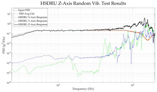Figure 14 illustrates the dynamic responses to the random vibration test in each axis. A narrow notching profile based on the maximum design load was applied to circumvent the over testing of the proposed HSDRU.