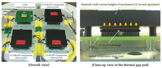 In the previous study [10], fatigue life tests and analyses of FPGA (CCGA624 package) according to the thermal pad compression ratios from 0% to 50% were conducted in a random vibration environment of 20 grms by adopting a CCGA624 daisy-chain, which has the same mechanical structure and electrical form/fit [15]. Figure 16 and Figure 17 present the test setup and the results of time histories for daisy-chain resistances for each specimen. The specimens were exposed to the random vibration environment at Table 10. The resistance value of the CG0 specimen rapidly reached a failure of the solder joint after 5.38 min of excitation, but there was no change in CG10 AB (10%) and CG50 (50%). Because the resistance values of the specimens with thermal pads did not vary in 1 h, the CG0 specimen exhibited 73 fractured solder joints, including partially cracked ones during the 20 min of random vibration. However, the other three specimens also exhibited cracks on solder joints, although their resistance values were not varied during the test. This is because the initial compressive static load of the pad maintained the electrical connection of the daisy-chain circuit, despite the crack propagation on the solder joint. However, the number of fractured solder joints of specimens with thermal pads was significantly fewer than that without the pad.