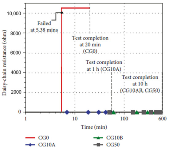 Figure 17. Time profiles of daisy-chain resistance for each specimen [10].