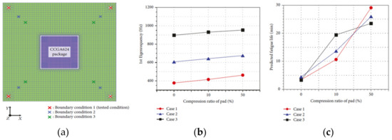 Figure 18. Numerical fatigue life prediction on solder joint [10]. (a) Boundary conditions for structural analysis. (b) 1st Eigen-frequency of the PCB for the compression ratio of the thermal gap pad in each case. (c) Fatigue life on solder joint for CCGA624 package with respect to the fatigue life in each case.