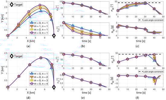 Figure 2 and Figure 3 illustrate the simulation results under various settings, given by Table 1, to evaluate the proposed law. First, Figure 2a–f presents the results under various settings of the gains m and n with a fixed impact angle and FOV constraints of and . The missile trajectories given by Figure 2a,d show that the proposed law could achieve the interception of the target with the prescribed impact angle of for all cases. The specific impact angles under the settings of , , , , , , and were produced as , , , , , , and , respectively. These results indicate that the proposed law fulfilled IACG with an accuracy within .
