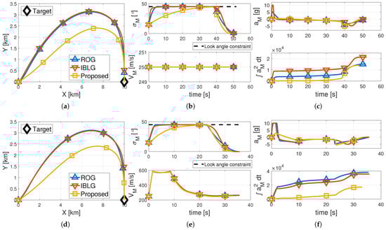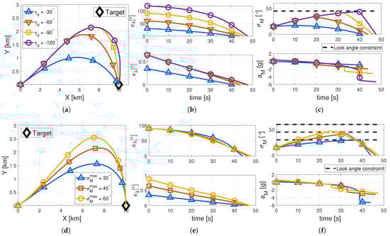 Figure 4a,b,d,e, shows that all three guidance laws achieved vertical interception of the targets without violating the FOV constraint of in both scenarios. The resulting impact angles under all guidance laws were within in every case.