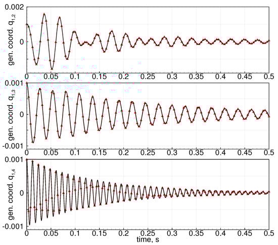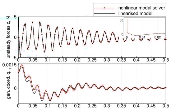 Comparison of results obtained by nonlinear modal solver and linear aeroelastic state-space model for Pazy wing structural model with = 50 m/s, = 0.001.