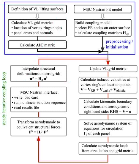 The aeroelastic simulations used to determine the steady static equilibrium points are performed by applying a steady iterative coupling loop. Here, the aerodynamic solution is obtained by the steady vortex lattice implementation, whereas the structural solution is computed separately using the MSC Nastran FE solver. The general workflow of the static coupling solution sequence is illustrated in Figure 2. In addition to the setup of the aerodynamic model, the initialisation process also includes the setup of the FE model and the coupling model as a preprocessing step. The aerodynamic forces are calculated as a function of the circulation and transformed into equivalent structural forces. Since a partitioned approach is used for solving the FSI problem in this aeroelastic framework, interface functions are available to provide the Nastran loadcard and read the results file of the nonlinear SOL400 sequence. Convergence is checked in terms of structural displacements, and the iterative loop is stopped once a specified residuum is reached. Before each new iteration loop, the VL grid as well as the coupling matrix and the AIC matrix are updated with respect to the structural deformations.