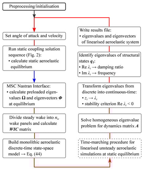 Linearised static coupling solution sequence including a time-marching procedure (optional) and the stability analysis.