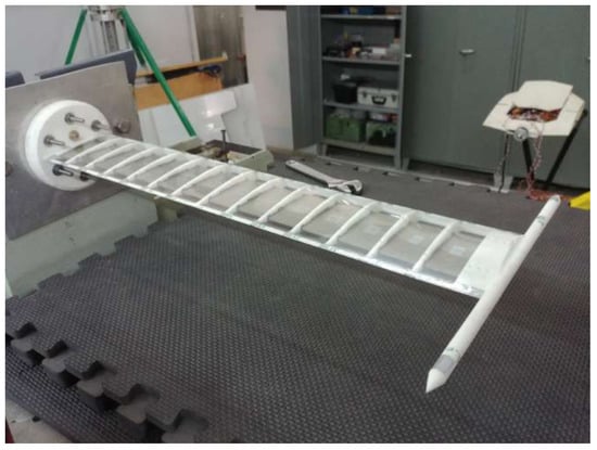 The wing, shown in Figure 4, has a span of 550 mm and a chord length of 100 mm with a symmetric NACA 0018 airfoil. It is assembled from an Aluminum 7075 spar and a PA2200, 3D printed rib structure. This is covered by an Oralight polyester film, which is applied by ironing and shrinks once the heat source is removed, resulting in a prestressing of the foil. This approach is chosen to ensure a smooth surface of the closed profile around the wing and to prevent buckling even at states of large deformations. As can be seen, a wing-tip rod is part of the 3D printed chassis, which can be used for attaching weights to modify the structural characteristics and thus the dynamic behaviour and the flutter speed. Important aerodynamic and geometrical properties of the Pazy wing are listed in Table 1, while a detailed description of the wing can be found in references [,].