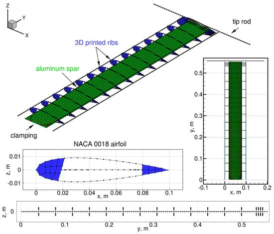 Besides various aerodynamic nonlinearities considered (e.g., transonic regime, dynamic stall or vortex-induced vibrations), interest has been focused mainly on structural nonlinearities caused by geometrically large deformations in recent years. This is the case because the capabilities of current aerodynamic analysis, such as CFD methods, are already far advanced, but there is a lack of adequate methods on the structural side. The most common aeroelastic simulation tools are still based on a linear description of the airframe and are expressed in the frequency domain. Therefore, recent studies on flexible aircraft and wing structures often use and improve nonlinear modal approaches to account for structural effects of large deformations, e.g., in references [,,]. However, both the analysis of aeroelastic systems as well as their optimisation require suitable methods to predict and possibly use structural nonlinearities, e.g., for passive load alleviation. In this regard, the verification and validation of aeroelastic analysis frameworks is heavily reliant on comparable data from other numerical methods or experiments. Unfortunately, measured data for experimental studies of highly flexible wings are still very limited, with the first study conducted by Tang and Dowell [] in 2001. A more recent study can be found in reference []. For this purpose, the Large Deflection Working Group was formed as part of the Third Aeroelastic Prediction Workshop (AePW3) [] initiated by NASA. The objective of this group is the aeroelastic investigation of the highly flexible Pazy wing wind tunnel model, which was designed at the Technion—Israel Institute of Technology. Due to the design of the model, very large static deformations of up to 50% with respect to the wing semispan are generated at the highest dynamic pressures and angles of attack in the wind tunnel. It is assembled from an Aluminum 7075 spar, and a PA2200, 3D printed rib structure, which is covered by an Oralight polyester film mainly used for radio-controlled aircraft. To simplify the modelling for computational methods and comparison of the results, the geometry is very generic and consists of a rectangular planform without sweep, taper and dihedral, as well as a symmetric NACA 0018 airfoil [].