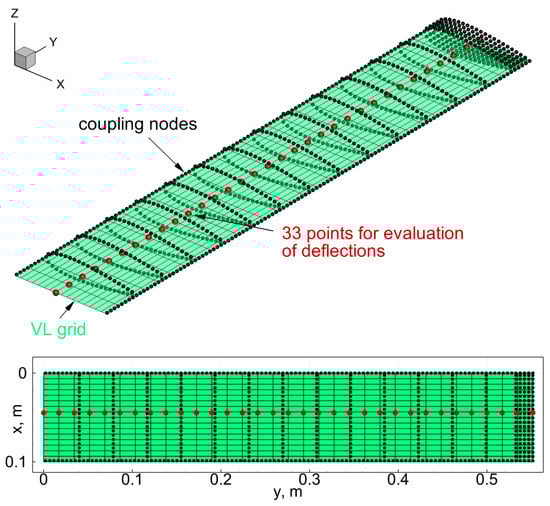VL grid, coupling nodes of the FE model selected for the transfer of forces/displacements and 33 equidistant points used for the evaluation of deflections.