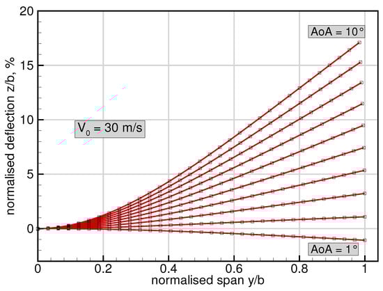 The results of the structural deformations at 30 m/s onflow velocity are shown in Figure 7, where the normalised out-of-plane deflection with respect to the wing span is plotted over the normalised spanwise coordinate . For simplification of further comparisons, the deformations are evaluated at 33 equidistant points in the spanwise direction, which are located at 44.75% chord (see Figure 6). This location was chosen as the results from Imperial College were obtained from SHARPy (Simulation of High-Aspect Ratio aeroplanes in Python []), which uses a nonlinear, geometrically exact beam formulation, where the beams’ elastic axis in the Pazy wing structural model is placed at this exact position. For an angle of attack of 1 degree, the wing exhibits negative deformation due to the gravity forces outweighing the aerodynamic lifting loads. From 2 degrees of angle of attack on, the deformations become positive and—as expected—increase with each increment in angle of attack. The maximum wing tip displacement in the z direction of approximately 17% is obviously achieved at 10 degrees angle of attack. The influence of geometric nonlinearities can be roughly estimated from the tip displacement in the spanwise (y) direction. In this case, the influences seem to be rather small, as the maximum spanwise displacement is approximately 2% with respect to the span of the wing. It can also be seen that the curvature due to bending mainly occurs between the clamping and about 40% span, while the remaining part of the outer wing shows only minor local out-of-plane bending deformations.