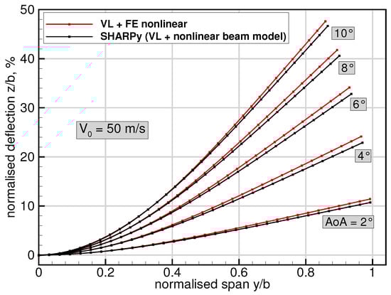 The results for five angles of attack at the highest onflow velocity of 50 m/s are depicted in Figure 8. With a maximum tip displacement of approximately 47% in the z direction and 14% in the y direction, the deformations obviously are in a nonlinear regime, and it becomes apparent that the application of a geometrically nonlinear solution method is indispensable here. While a geometrically linear solution at velocities below 30 m/s might only lead to small deviations, in this case it would clearly lead to an arbitrary extension of the wing’s span and in turn to an increase of the wing area by more than 14%. This would finally result in a significantly different lift distribution and deformation of the wing. Furthermore, it can be seen that the deflections obtained from SHARPy provided by Imperial College appear to be smaller with an almost constant deviation of 1.2% normalised deflection in the z direction between 4 and 8 degrees angle of attack. One reason for these differences can be the different positions of the elastic axis in both models. While the axis of the beam model remains constant at 44.75% chord, the axis of the full 3D FE model changes slightly with respect to the spanwise coordinate, thus leading to a different distribution in the torsional moment. However, the main reason for the deviations is still found in the different structural solution methods, where, for example, a change of camber of the wing due to the natural coupling of out-of-plane and in-plane bending deformations is not accounted for in a beam model. Previous validations of the static coupling solver with results from a nonlinear, strain-based beam solver for a similar test case (up to 35% displacement with respect to semi-span) have shown comparable deviations in terms of out-of-plane displacements (see []).