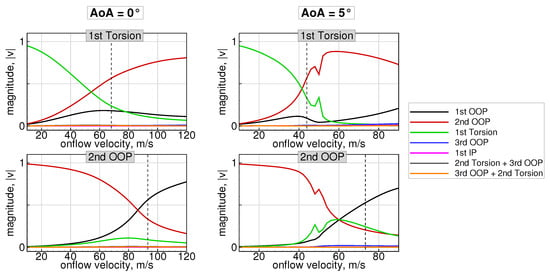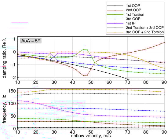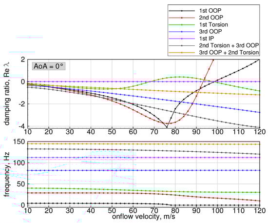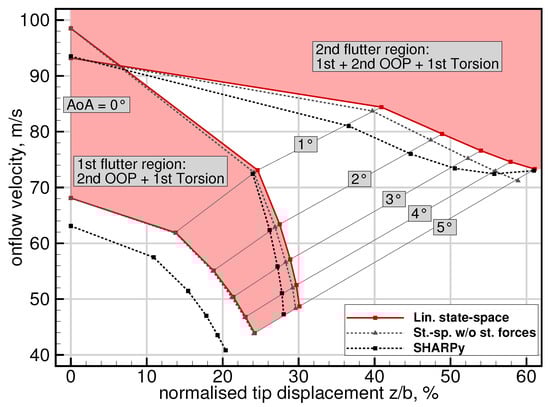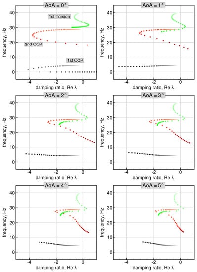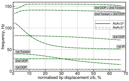 Afterwards, the real parts of the eigenvalues represent the decay ratios and the imaginary parts represent the frequencies of the system’s modes. The system is then regarded as internally stable, if all eigenvalues have a strictly negative real part []. In summary, the presented method for stability analysis accounts for all three nonlinear effects involved in highly flexible wings undergoing large deformations. This includes the change in structural eigenvalues and eigenvectors due to the deformation, the change in the AIC matrix due to varying wing geometry, as well as the effect of steady aerodynamic loads at aeroelastic equilibrium.