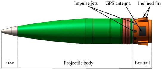 The high spin rate of spin-stabilized projectiles brings great challenges to attitude measurement and trajectory control. Inspired by PGK, a dual-spin structure was adopted. The measurement and control components were arranged on a de-spin body (aft body), while the projectile body (forward body) was characterized by a high spin rate to maintain the stability of the entire projectile. Since the impulse jets were mounted behind the center of mass of spin-stabilized projectiles, the boattail of a projectile was transformed into a guided boattail connected to the projectile body avia a bearing. To reduce the spin rate of a guided boattail, six inclined fins were mounted on it. All electronic devices and control mechanisms were located inside the guide boattail. The overall structure of the dual-spin projectile is shown in Figure 1.