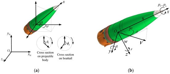 Two reference frames are introduced below to describe the projectile movement. One is the ground reference frame (Figure 2a), and the other one is the no-roll reference frame which is fixed to the projectile (Figure 2b). The origin () of the ground reference frame was located at the launch point. is the axis launch direction in the horizontal plane, and the axis is oriented in the upright direction. The axis can be determined by the right-hand rule. The origin of the no-roll reference frame is the center of the projectile mass. The axis aligns with the projectile axis and points to the nose, thus defining a positive direction. The axis is perpendicular to the axis in the horizontal plane. Like the axis, the axis can be determined by the right-hand rule. The reference frames are shown in Figure 2.