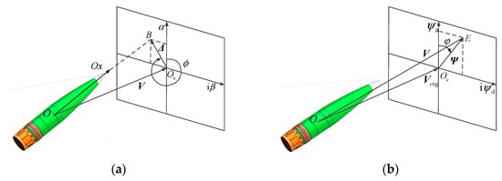 Any point along the direction of the velocity vector of the projectile is first chosen. Then, a complex plane that is perpendicular to the velocity vector passing through the point is created. The intersection of the axis and the complex plane is defined as the point . Vector represents the total AOA in the complex plane (see Figure 3a). In the same way, the intersection of the changing velocity vector and the complex plane is defined as the point . Vector represents the velocity deflection angle in the complex plane (see Figure 3b). When the total AOA of the projectile changes, the trajectory of the point in the complex plane reflects this change. Analogously, the trajectory of the point in the complex plane can reflect the change in the velocity direction.