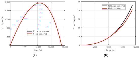 Two entire trajectories: one is a normal trajectory without control, and the other one is a correction trajectory with a single impulse jet being ignited. (a) altitude vs. range, (b) crossrange vs. range.