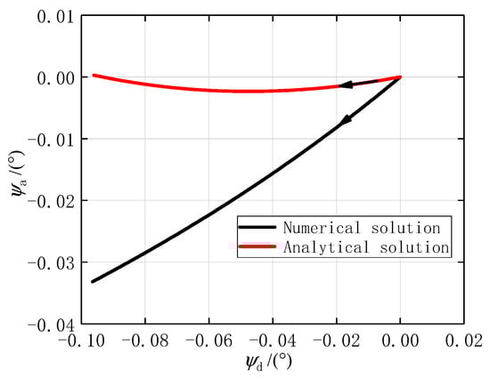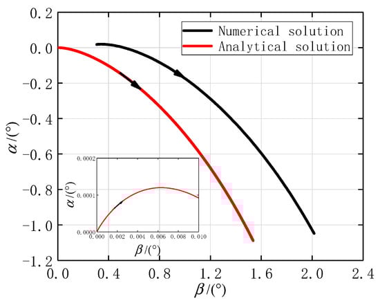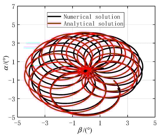 The angular motion of the projectile at the first stage is shown in Figure 6. The results obtained by the two methods are in good agreement. Since the actual initial total AOA of the projectile was not zero, a difference between the numerical and analytical solutions in angular motion was caused by the initial conditions. The difference increases with the increasing of the angle. That is because when the angle is large enough, the aerodynamic action works. The initial total AOA in the numerical solution was caused by gravity. This phenomenon is called dynamic equilibrium angle []. The black arrows on the curves indicate the angular motion direction. When the impulse jet was ignited at 84.4562 degrees, the projectile axis moved in the opposite direction of the impulse force from the origin, thus forming positive and angles. According to Equation (44), the angular motion in the first stage should be a three circular motion. Moreover, the angular frequency of the fast circular motion was much higher than the frequency of other motions. Thus, the projectile axis moved in the direction where the value of is negative and rapidly decreased.