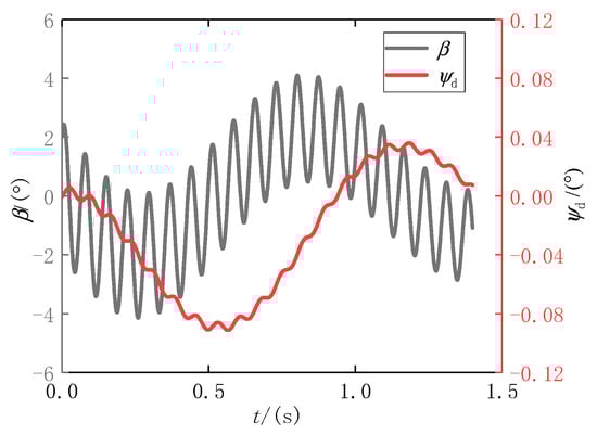 The relationship between and that was obtained by the numerical method is depicted in Figure 9. When was greater than zero, increased. When was less than zero, decreased. This observation explains how the aerodynamic angle of attack affects the velocity direction.
