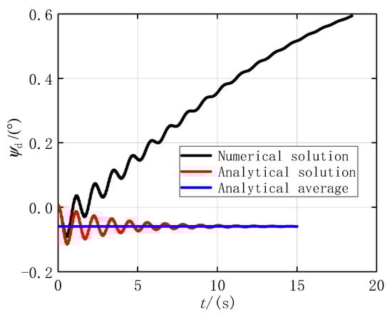 Three types of at the second stage are shown in Figure 10. Since the AOS caused by gravity was positive and increased over time, the numerical solution increased. As such, the difference between the two methods increased. The analytical solution converged to a negative analytical average value, which was obtained according to Equation (57). Although the initial that was caused mainly by the impulse force was positive, it rapidly became negative due to the bicircular motion. Since the convergence center of was negative, the average value of was also negative.