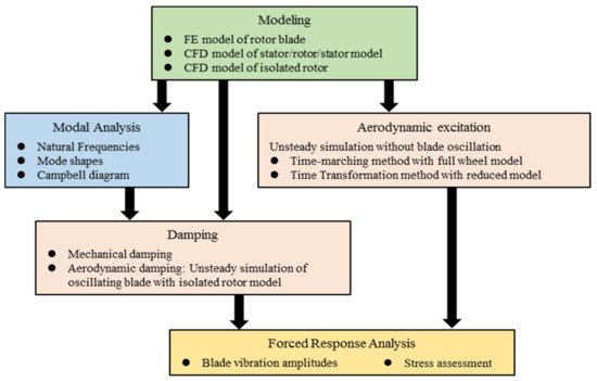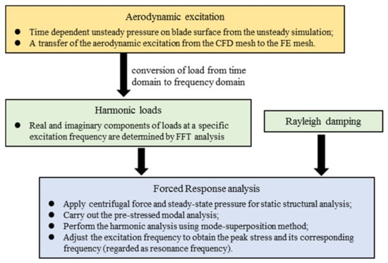 According to the characteristics of the aerodynamic excitations in the forced vibration, nodal forces and displacements can be expressed as multi-harmonics, as shown in Equation (18). This makes it possible to obtain the response level by harmonic analysis, which requires the loads to vary harmonically with time. The harmonic forced-response method solves the response in the frequency domain with harmonic forces from the unsteady simulations; the flow chart of this method is shown in Figure 3.