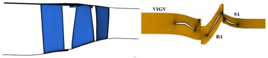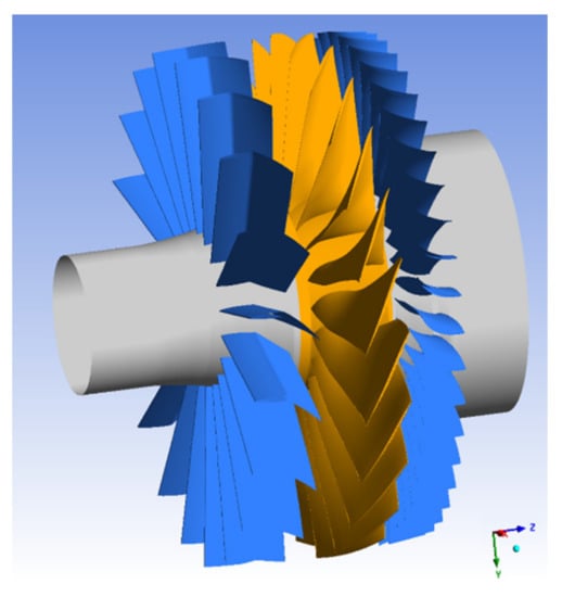 - Rai, M.M. Navier-Stokes Simulations of Rotor-Stator Interactions Using Patched and Overlaid Grids. J. Propul. Power 1987, 3, 387–396. [Google Scholar] [CrossRef]