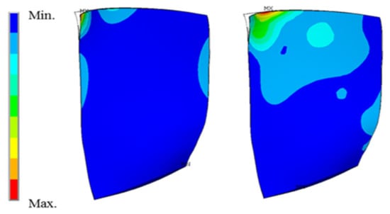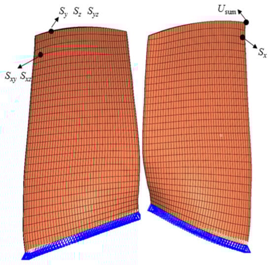 The above variables are the results in cylindrical coordinates. It can be observed that for the displacement results, the circumferential and axial components are larger, and the positions with large displacement were at the leading edge in the tip region, which is consistent with the M8 mode. For the stress results, the circumferential normal stress and shear stress were larger, and the larger position was near 20% of the chord length in the blade tip region.