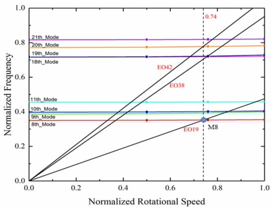 From the results of the modal analysis, the Campbell diagram is illustrated in Figure 6 to determine the operating points for further investigation, in which the rotational speed was normalized by the design rotation frequency and the frequency by an arbitrary value. The possible resonance crossings with the BPF (EO19, EO42) and its multiples (EO38) can be identified within the operating speed range of the compressor. According to the vibration test, the vibration stress was significant at a 74% rotational speed. Thus, it was chosen for the investigation, where the vibration mode M8 occurs due to the upstream wake excitation. The predicted mode shape of the M8 is depicted in Figure 7, which is a high-order mode with a large vibration amplitude near the leading edge at the blade tip region. The comparisons of the different methods were also limited to the resonance rotational speed of 74% rotational speed and the M8 mode.