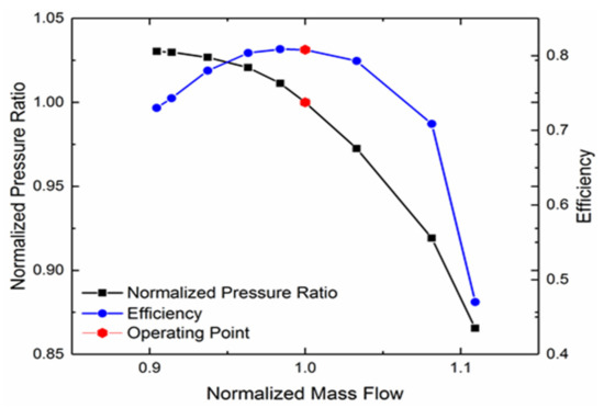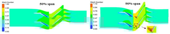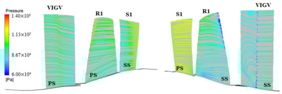 The performance map for the 1.5 multistage compressor at the 74% rotational speed was computed, and the operating point was determined based on the experimental data, as shown in Figure 9. It was normalized by the mass flow and pressure ratio at the operating point. It can be seen that the efficiency of the operating point was almost the highest. For a better understating of the flow properties at the operating point, the Mach number and surface streamline distributions are given in Figure 10 and Figure 11. It can be observed that due to the low rotational speed, there was no shock wave in the passage, and most areas were subsonic flow. In addition, obvious low-speed regions existed after the rotating axis of the VIGV and the leading edge of the R1 at the suction surface. The range of the low-speed region became larger with the increase in the blade span. From the streamline distribution, it can be intuitively seen that large-scale separation occurs at the suction surface of the VIGV and the leading edge of the R1 in the tip region, which was accompanied by the intense three-dimensional radial flow.