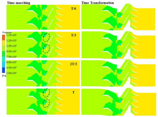 For the forced response analysis, it was important to validate the predict accuracy of the unsteady pressure and the dominant BPF from the VIGV and S1 on the rotor blade. An accurate prediction at the tip region was crucial for the evaluation of the aerodynamic excitation because most vibration modes showed significant amplitudes at this location. Four characteristic time steps were selected to compare the pressure distributions at the 95% span from the TM and TT methods, as shown in Figure 12. The transient interaction of the stator wake with the rotor at the interface showed a good agreement. The largest difference between the two methods is that the TM method presented non-uniformity along the circumferential direction (as shown in the dotted circle); however, the TT method cannot simulate this phenomenon. While there are some differences in detail, the predicted flow properties were very similar.