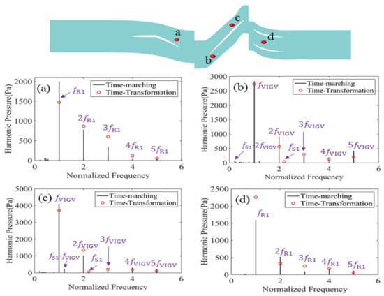 After the comparison of the flow field simulation, closer attention to the frequency capture ability was also required. The time-resolved pressure data for a single revolution were transferred into the frequency domain by an FFT analysis, as shown in Figure 13. Based on the results in Figure 12, four monitors placed at the 95% span were selected. One monitor was placed at the VIGV passage at an approximately 85% axial location, while the others were placed in the rotor passage at the 35%, 70%, and, in the S1 passage, at the 15% axial locations. Again, comparisons between the TM and TT methods were made. The spectrum of the pressure had a good agreement and showed the influence of the corresponding BPF as well as its harmonics, as expected. At the stator monitors (a and d), the rotor passing frequency and higher harmonics were captured in both the TM and the TT methods. At the rotor monitors (b and c), the signals were much more complex from both the interaction of the VIGV and S1. The TT predictions were close to the TM solution but had a loss of some harmonics, such as the linear combination of and .