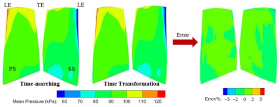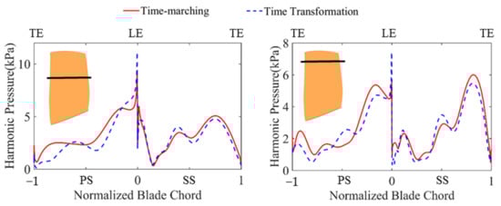 The TT method was validated on several test cases [,,,]. However, the discussion of this method in the open literature was more concerned about the total performance parameters (mass flow, efficiency, and total pressure ratio) and time-averaged variables. Few comparisons of pressure disturbance at the blade surface were reported, which are important to the forced response analysis. In this article, the results of pressure disturbance by the TT method and the traditional method (time-marching method) are compared in detail, and the relative error of TT method is clarified.