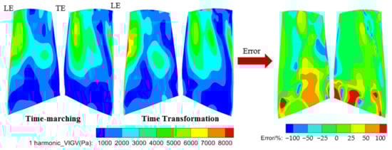 For further comparison, the distributions of the mean pressure and harmonic pressure from the VIGV wake on the whole rotor blade surface are given in Figure 15 and Figure 16. It showed an excellent agreement at the mean pressure distribution, and the error in most areas was in the range of −2% to 2%. In terms of the harmonic pressure, it could be observed that the TT method delivered some deviations compared with the TM method. In the critical area for the M8 mode, the tip region near the leading edge, the TT method delivered a similar prediction on the blade surface with the TM method. There was a discrepancy of 25% at most positions expect for the blade root. Fortunately, the harmonic pressure amplitude was small and the vibration amplitude close to zero at these locations, which would not affect the vibration at the tip region.