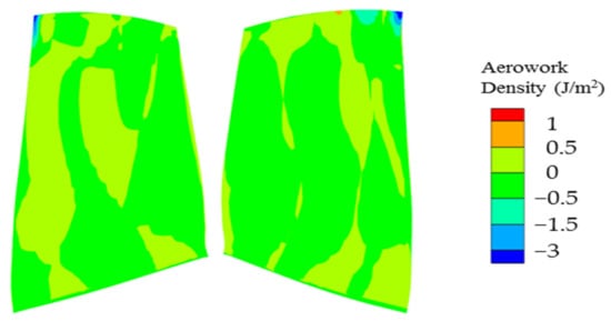 It was set to resolve only one frequency and mode shape by the energy method presented in Section 2.2, corresponding to the investigated resonance crossing M8 mode. Furthermore, according to the resonance theory [], only a nodal diameter of three can be excited for the resonance crossings with the EO19, and the wave type was a forward-traveling wave (FTW). Figure 17 represents the aerowork density distribution for the nodal diameter of three. It is clear that the aerowork density at most areas was close to zero, except that there was a large negative aerowork density at the leading edge in the tip region, which corresponds to the position with large vibration amplitude of the M8 mode. This led to a positive damping ratio of 0.3%.