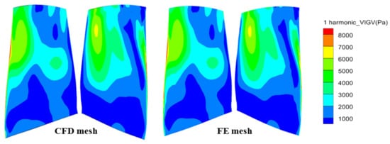 In this study, the normal component of forces resulting from the static pressure was taken into account for the aerodynamic excitation. For the forced response analysis, a transfer of the aerodynamic excitation from the CFD mesh to the FE mesh was required. In the Ansys mechanical software, the X, Y, and Z components needed to be given for the force loading. In the process of interpolation, the nearest neighbor approach can ensure that the value of the variable is credible. However, the deviations of the force directions might occur. Thus, the pressure interpolation was applied, which can automatically load along the normal direction of the blade surface in the software.
