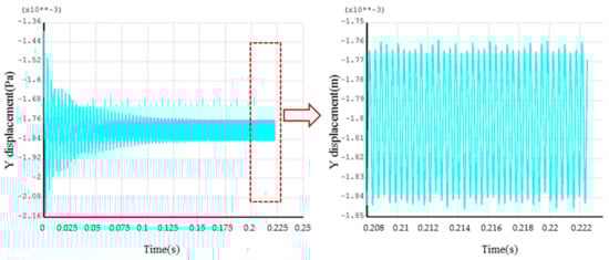 For the transient dynamic method, the aerodynamic excitation was determined as 1596 time-steps per revolution, corresponding to 84 steps in one period for EO19 excitation, which can ensure the accuracy of the calculation results. In order to ensure the convergence of the simulation, a total of 30 cycles were applied. Figure 19 shows the convergence history of the monitor in Figure 5. It can be seen that the results are convergent, indicating that the choice of calculation cycle was appropriate. The subsequent spectrum analysis extracted the stable results for the FFT analysis.
