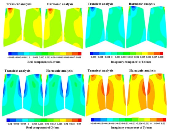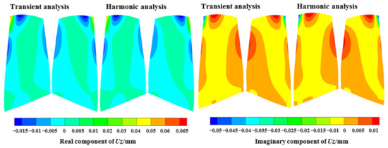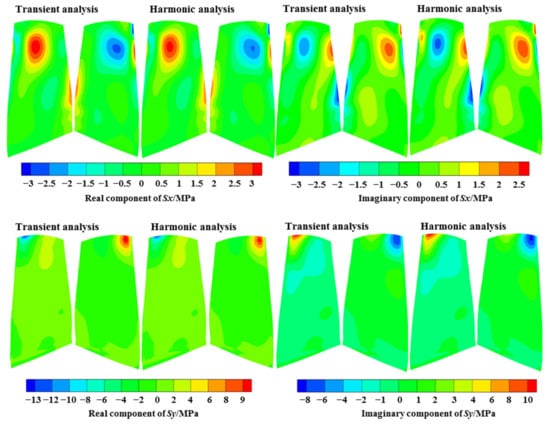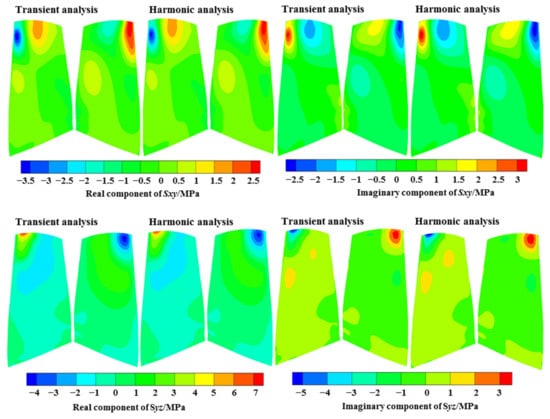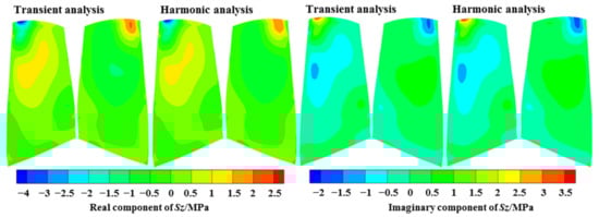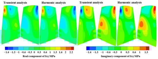 The harmonic analysis was compared with the transient analysis regarding the predicted results under the EO19 aerodynamic excitation at the resonance frequency, as shown in Figure 20, Figure 21, Figure 22. The distributions of the fundamental physical quantities at the blade surface, including three displacement variables , , and three normal stress variables , , and ; and three shear stress variables , , and showed an excellent agreement by the two methods, both at the real component and the imaginary component.