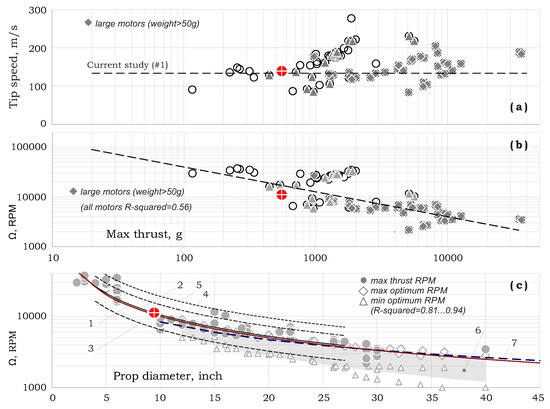 Figure 2a presents propeller tip velocity () vs. max-thrust.