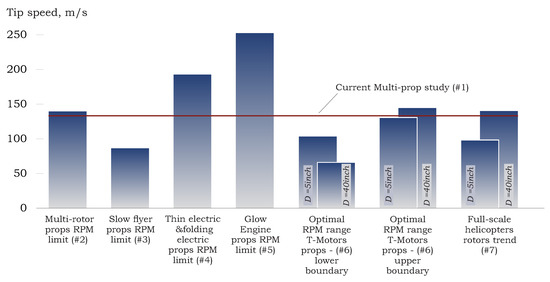 Reference [15] presents tip velocity recommendations for APC propellers (#2–#5), while Ref. [16] shows optimal RPM range for T-motors propellers (#6). These are described in Figure 3 where the typical range for full-scale helicopters is also included (#7), see Ref. [4].