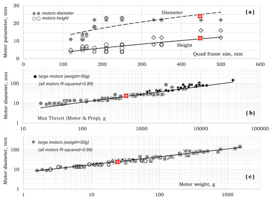 Figure 5 presents motor diameter as a function of the frame size, thrust, and motor weight. Typically, frame size is measured as the hub-to-hub distance. For a given number of propellers, it should be well correlated with the propeller’s diameter. Figure 5a also presents motor height as a function of the frame size.